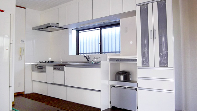 | 商品仕様 | ■キッチン キッチン:クリナップ ラクエラ(アロマホワイト・壁付I型 W2550 家電収納 カップボード) 天井・壁:サンゲツ リザーブ 床:東洋プライウッド シストS(ウォールナット) ■和室 クローゼット:Panasonic リビエ クローゼット8尺×2(内部収納棚造作)/3枚引き戸(Uオーダー) 床(縁無し半畳タイプ 琉球調畳):ダイケン タフアートえんこうⅢ(松柾目柄) 壁:サンゲツ リザーブ |